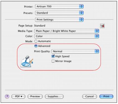 After selecting the basic options on the Print window, you can click Advanced and select advanced options.