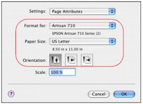 3. Select the Paper Size setting for the paper you loaded. A Custom option is also available so you can create a custom size (in OS X 10.3.9, select Custom Paper Size from the Settings pop-up menu).If you want to print a borderless photo, select the paper size with a Borderless option.
