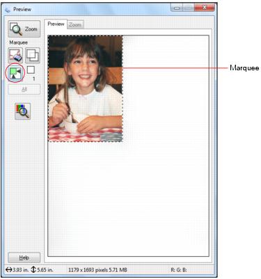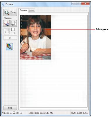 • Thumbnail preview: Create a marquee by placing your cursor in one corner of the desired scan area, clicking, and dragging the cursor to the opposite corner.