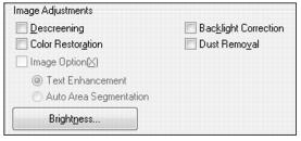 Removes the rippled pattern that can appear in subtly shaded image areas, such as in skin tones. Also improves results when scanning magazine or newspaper images. The results of descreening do not appear in the preview image, only in your scanned image. Backlight Correction Text Enhancement Sharpens the appearance of letters in text documents. (Available only when you select Text/Line Art, Newspaper, or Magazine as the Document Type setting.) Check the Image Option box, then select the setting. Auto Area Segmentation Makes grayscale images clearer and text recognition more accurate by separating the text from the graphics. (Available only when you select Text/Line Art, Newspaper, or Magazine as the Document Type setting and Black&White as the Image Type.) Check the Image Option box, then select the setting. Adjusts the level at which the black areas in text and line art are delineated. (Available only when you select Black&White as the Image Type setting.) Click the Brightness button to access the setting. Adjusts the difference between the light and dark areas of the overall image. Click the Brightness button to access the Contrast setting.You can scan images at their original size, or reduce or enlarge them as you scan them. You can also select a specific scan size (such as 8 × 10 inch [203 × 254 mm] for photos) so you can crop the image using the correct proportions.