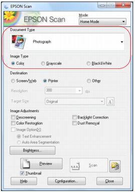1. Select the type of original you’re scanning as the Document Type, such as Photograph or Text/Line Art.