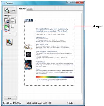 8. Now you can view and print the image.You can adjust the scanned image area by creating and/or moving the dotted line (marquee) outlining the scan area: