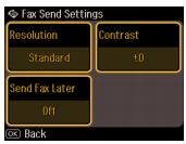 Send Fax Later to specify what time you want to send your fax. (You cannot send another fax job until the delayed fax has been transmitted or cancelled.)