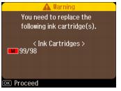 Your Artisan 800 Series and its software will let you know when an ink cartridge is low or expended.You cannot print or copy when an ink cartridge is expended even if the other cartridges are not expended. Replace any expended cartridges before printing or copying. You can still scan, fax, and view photos on the LCD display.Note:
