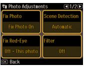 • For the best quality printing, select Fix Photo and choose Fix Photo On. This automatically adjusts brightness, contrast, and saturation to best effect. You can also choose Fix Photo Off to turn off this adjustment, or P.I.M. to use your camera’s PRINT Image Matching® or Exif Print adjustments.To change the automatic adjustment mode of the Fix Photo setting, select Scene Detection and choose Automatic, People, Landscape, or Night Scene.Note: