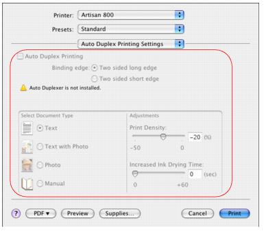 Print Double-Sided With the Optional Auto Duplexer If you have the optional auto duplexer, you can print on both sides of the page automatically. 1. Select Auto Duplex Printing Settings from the pop-up menu. 2. Select Auto Duplex Printing. 3. Select the binding option you want. 4. Select the type of document you’re printing. 5. Adjust the print density and drying time to prevent ink from bleeding through the page when you print on plain paper. When you’re finished, you’re ready to print.