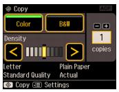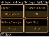 7. To change any of the print settings displayed on the screen, press Menu and select Paper and Copy Settings.