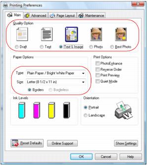 • Quiet Mode: reduces the print speed slightly for quieter operation (only available when Plain Paper is selected for Type).