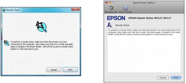 Macintosh: Open the Applications folder, then the Epson Software folder, and then open EPSON Printer Utility 4. Then select Nozzle Check.