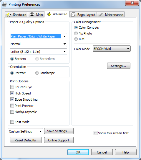 Click the Advanced tab at the top of the printer settings window to select Advanced options.