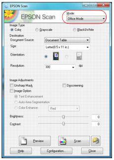 1. Start Epson Scan and select Office Mode as the Mode setting.