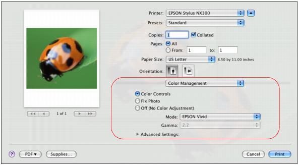 • Color Controls lets you select a color Mode for printing the colors in photos and graphics: EPSON Vivid, or AdobeRGB.Gamma adjusts the midtone density in the print (only available when AdobeRGB is selected).Advanced Settings adjust Brightness, Contrast, Saturation, and individual Cyan, Magenta, and Yellow color tones.