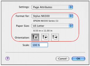3. Select the Paper Size setting for the paper you loaded.If you want to print a borderless photo, select the paper size with a Sheet Feeder - Borderless option.You can load paper in these sizes and select the size in the printer software. A Custom option is also available so you can create a custom size (Mac OS X 10.4.x only).Envelope #10 (4 1/8 × 9 1/2 inches)