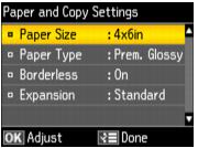• To adjust the amount of image expansion when printing borderless photos, select Expansion, then choose Standard, Medium, or Minimum.