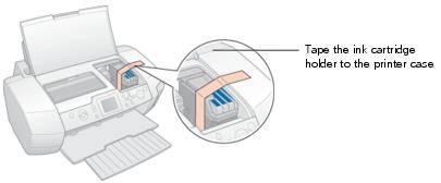 5. Open the printer cover. Secure the ink cartridge holder to the printer with tape as shown, then close the printer cover.