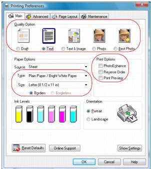 Click the Main tab on the top of the printer settings window to select your basic print options.