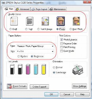 Click the Main tab at the top of the printer settings window to select your basic print options.