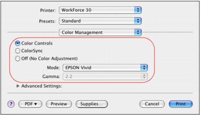 • Color Controls lets you select a color Mode as the method of printing colors for photos and graphics (EPSON Vivid or Adobe RGB).Gamma when using Adobe RGB, adjusts the midtone density in the print.Advanced Settings adjust Brightness, Contrast, Saturation, and individual Cyan, Magenta, and Yellow color tones.