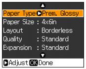 • To adjust the amount of image expansion when printing borderless photos, select Expansion and choose Standard, Min, or Mid.