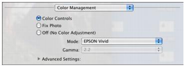 • Color Controls lets you select a color Mode for printing the colors in photos and graphics: EPSON Vivid or AdobeRGB.Advanced Settings adjust Brightness, Contrast, Saturation, and individual Cyan, Magenta, and Yellow color tones.Gamma adjusts the midtone density in the print (available only when using AdobeRGB)