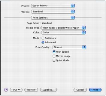 5. For quieter printing when Plain Paper/Bright White Paper is selected for the Media Type, click Quiet Mode.