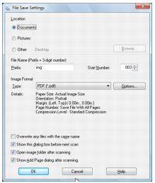 8. In the scan file settings window, select a folder for your file and select PDF as the file Type setting.