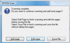 12. If you’re scanning only one page, click Save File.If you’re scanning multiple pages, click Add Page. Then replace the first page on the scanner glass with the second page and click Scan again, repeating as necessary for each page. When you’re finished, click Save File.If you want to delete or reorder any of the pages, click Edit Page, then use the icons on the bottom of the editing window. (Click Help for details.) When you’re finished, click Save File.