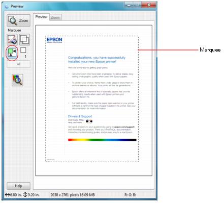 7. If desired, you can draw a marquee (or box) around the area you want to scan in the Preview window.