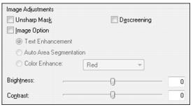Turn on to make the edges in different areas of your image clearer. Turn off to leave softer edges. Removes the rippled pattern that can appear in subtly shaded image areas, such as in skin tones. Also improves results when scanning magazine or newspaper images. The results of descreening do not appear in the preview image, only in your scanned image. Text Enhancement Adjusts the level at which the black areas in text and line art are delineated, improving text recognition in OCR programs. Check the Image Option box and then select the setting. Auto Area Segmentation Makes grayscale images clearer and text recognition more accurate by separating the text from the graphics. (Available only when you select Black&White as the Image Type.) Check the Image Option box and then select the setting. Enhances red, green, or blue shades in the scan. (Available when you select Grayscale or Black&White for the Image Type setting.) Check the Image Option box and then select the setting.