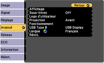 USB Display : sélectionnez cette option si vous avez raccordé un ordinateur au port USB Type B du projecteur pour projeter des images. Link 21L : permet à un ordinateur Windows de commander à distance le projecteur grâce à une connexion USB en utilisant l'utilitaire Link 21L. |