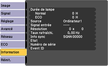 | Durée de lampe | Affiche le nombre d'heures (H) d'usage de la lampe en mode de consommation d'énergie Normal et ECO; si l'information affichée est en jaune, ne tardez pas à vous procurer une lampe de remplacement d'Epson. |