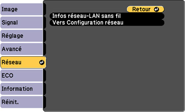 Les paramètres du menu Réseau vous permettent de voir les renseignements sur le réseau et de configurer le projecteur pour la surveillance et la commande en réseau.
