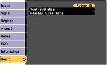 d'utilisation de la lampe avec l'option Réinitial. durée lampe.