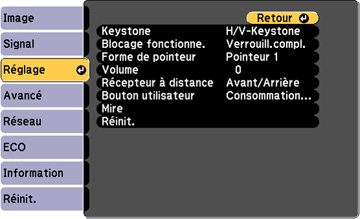 Les options du menu Réglage vous permettent de personnaliser les diverses fonctions du projecteur. Les paramètres disponibles varient selon la source d'image sélectionnée.