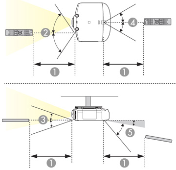 Veillez à orienter la télécommande vers les récepteurs du projecteur selon les angles indiqués ici.