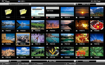 1. Press the USB button on the projector remote control. The PC Free screen appears.