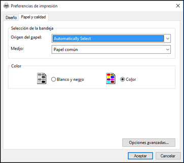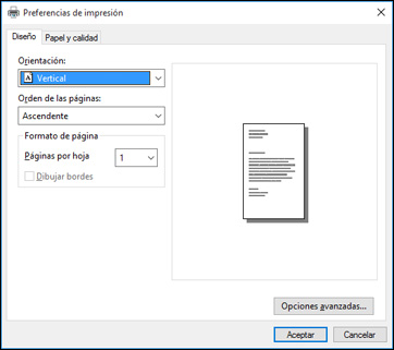Verá la ficha Diseño de la ventana de los ajustes de la impresora: