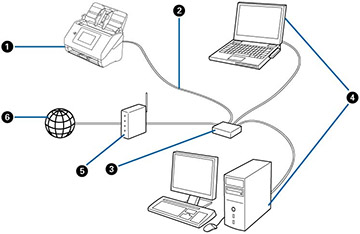 Você pode configurar seu scanner para se comunicar com o seu computador em uma rede com fios, conectando-o a um roteador ou hub usando um cabo de Ethernet.