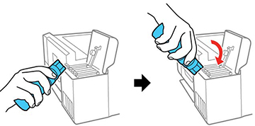 Note: Refer to the color-coded sticker on the ink tank unit to identify the color of each tank. Do not force the bottles into position; they are keyed for each color.