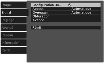 Affichage 3D : active le mode 3D. Format 3D : sélectionne le format 3D. Conversion 2D à 3D : convertit les images 2D à des images 3D. Profondeur 3D : permet de régler la profondeur de l'image 3D. Taille Écran Diagon. : sélectionne la taille actuelle de l'écran afin de maximiser l'effet 3D. Luminosité 3D : règle la luminosité de l'image 3D. Inverser lunettes 3D : permet d'inverser les images projetées pour l'oeil gauche ou droit (activez cette fonctionnalité seulement si les images 3D ne sont pas affichées correctement). Notification aff. 3D : permet la notification de visionnement lorsque vous utilisez le mode 3D. |