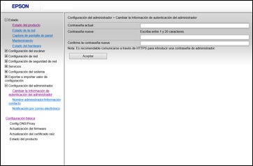 1. Acceda a Web Config, seleccione Configuración del administrador y seleccione Cambiar la Información de autenticación del administrador. Verá una ventana como esta:
