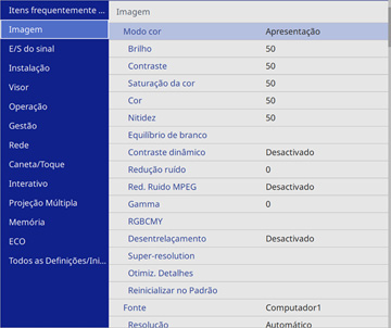 | Reinicializar as definições da Imagem | — | Retorna as configurações do menu Imagem para seus valores padrão. |