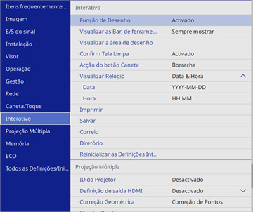 | Reinicializar as Definições Interativas | — | Retorna todas as configurações do menu Interativo para seus valores padrão. |