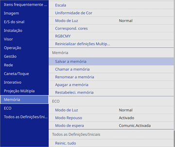 As configurações no menu Memória permitem que salve e carregue configurações de qualidade de imagem na memória do projetor.