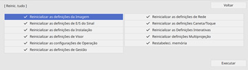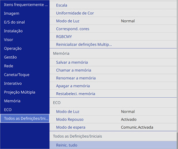 Você pode retornar a maioria das configurações do projetor aos seus valores padrão usando a opção Reinic. tudo no menu Todos as Definições/Iniciais.