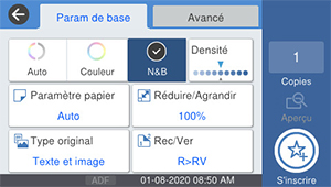 4. Sélectionnez la fonction que vous voulez configurer pour les paramètres prédéfinis. L'écran principal de cette fonction s'affiche, tel que cet écran Copie :