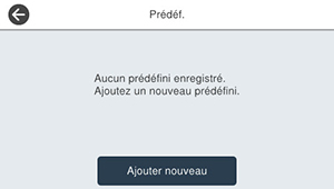 Lorsque vous copiez, télécopiez ou numérisez, vous pouvez utiliser ces paramètres prédéfinis en sélectionnant Prédéf., puis en sélectionnant le nom que vous avez attribué à cet ensemble dans la liste.