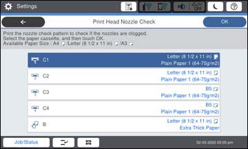 Select the paper cassette you want and select OK. The nozzle pattern prints.