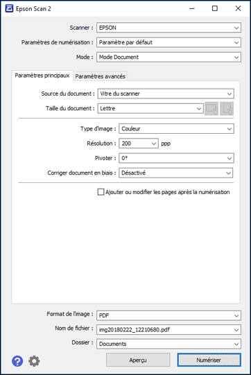 fichier numérisé. Si nécessaire, sélectionnez Paramètres pour modifier les options du nom de