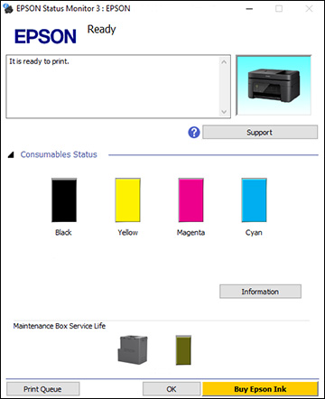 During printing, you see this window showing the progress of your print job. It allows you to control printing and check ink cartridge status.